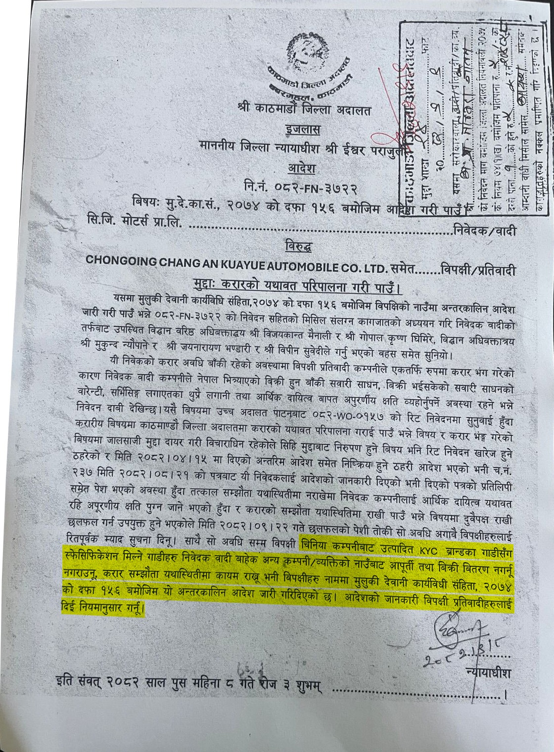 काठमाडौं जिल्ला अदालतको आदेशमा केवाइसी ब्रान्डका सवारीसाधन अन्य कम्पनी वा व्यक्तिको नामबाट उत्पादन, आपूर्ति तथा बिक्री वितरण भइरहेको अवस्थामा करार सम्झौता, बौद्धिक सम्पत्ति अधिकार र उपभोक्ता हितमा गम्भीर क्षति पुग्ने उल्लेख गरिएको छ । अन्तिम फैसला नआएसम्म यस्ता सबै गतिविधि यथास्थितिमा राख्न अदालतले आदेश दिएको हो ।