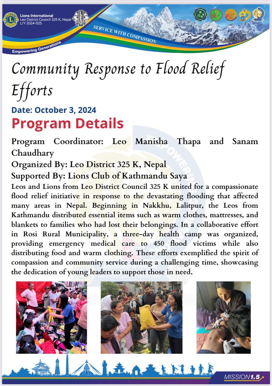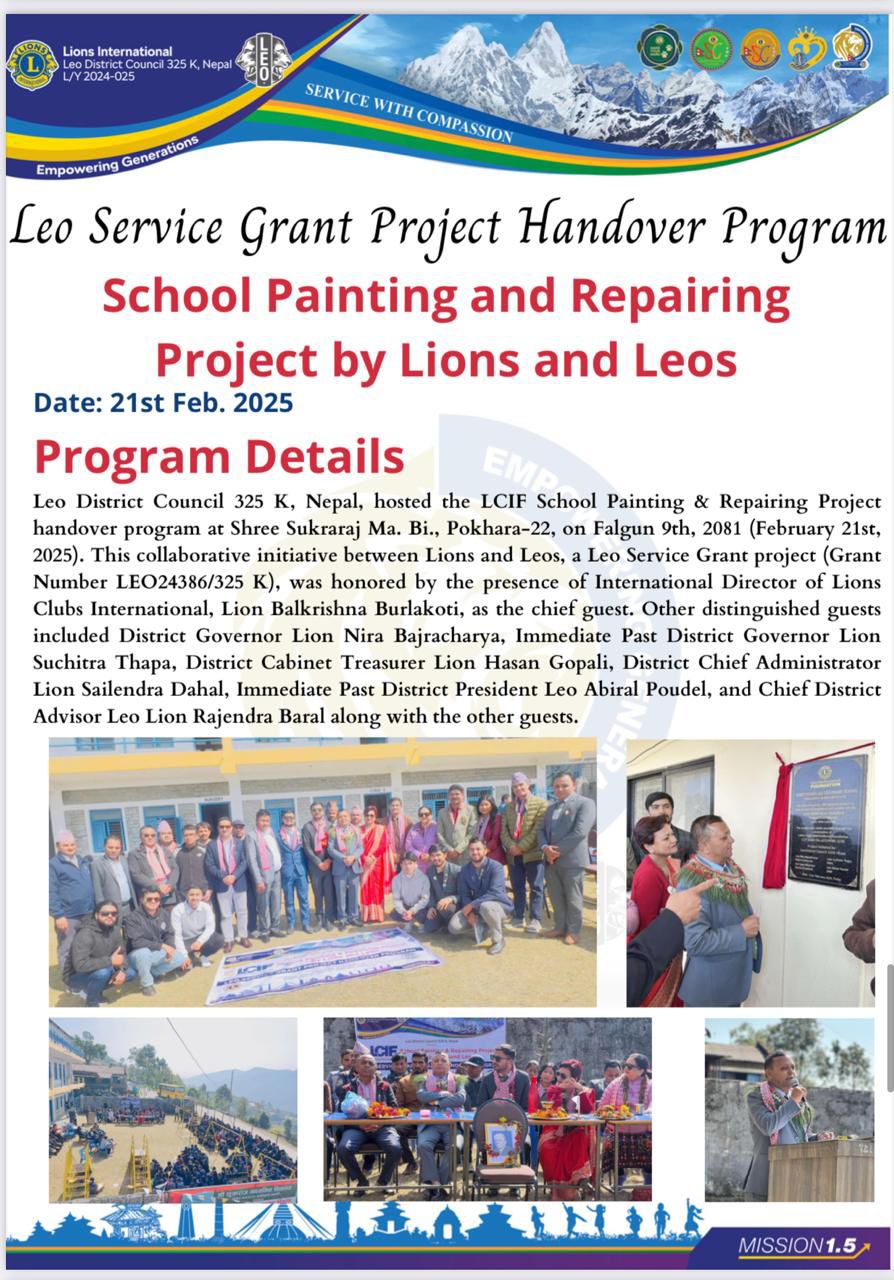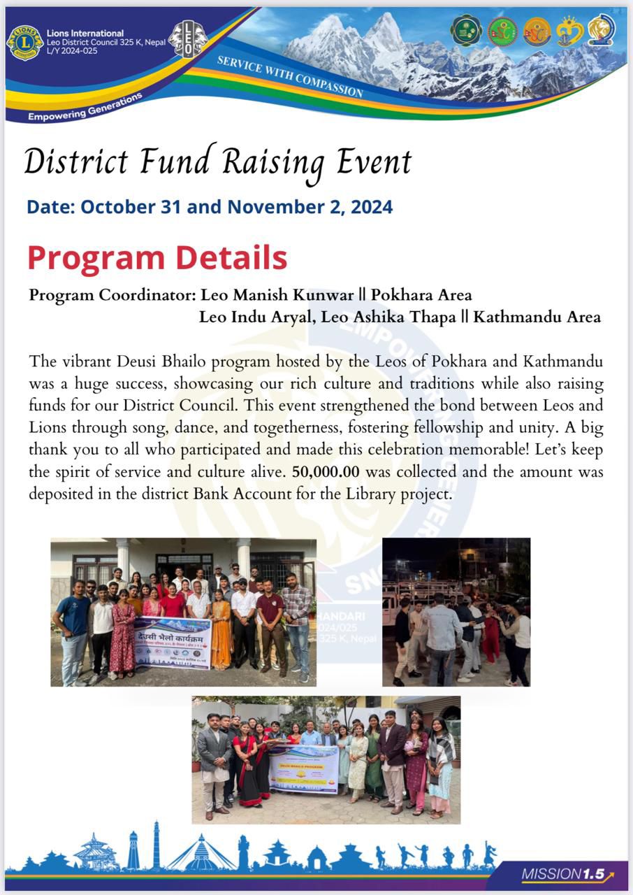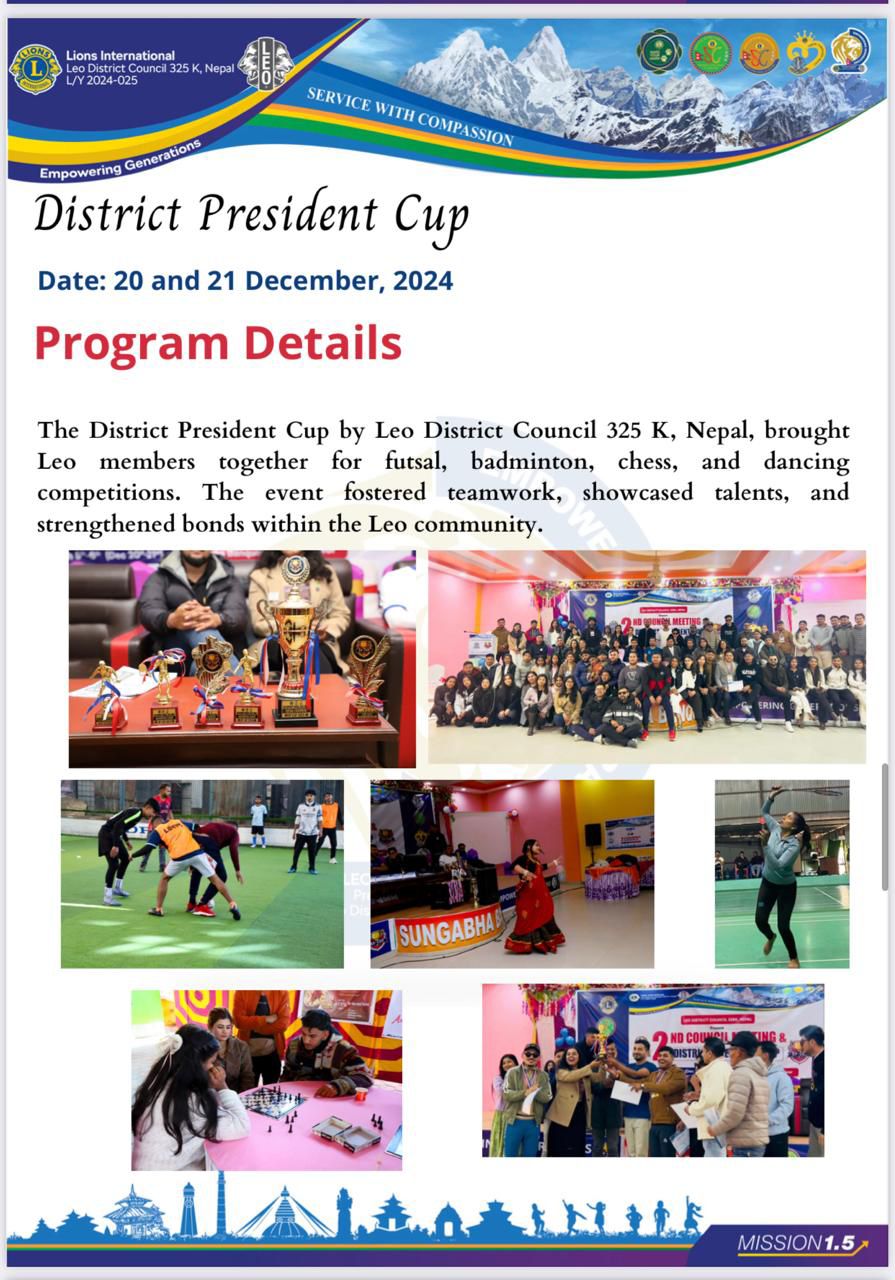 वर्तमान लियो वर्षमा लियो जिल्ला परिषद् ३२५ के, नेपालको जिल्ला अध्यक्षको रूपमा, लियो साजन भण्डारीले आफ्नो दूरदर्शी नेतृत्वमार्फत सेवा, नेतृत्व विकास र अन्तर्राष्ट्रिय पहिचानलाई समेट्ने थुप्रै उदाहरणीय कार्यक्रमहरू संचालन गर्नुभएको छ। उहाँको कार्यकालमा सम्पन्न प्रमुख गतिविधिहरूमा क्लब अफिसर्स स्कूलिङ, अन्तर्राष्ट्रिय टविनिङ र “MEGA TREE PLANTATION”, बाढी पीडितप्रति राहत सहयोग, Mr. and Miss Leo Nepal, फन्ड रेजिङ कार्यक्रम, विश्व मधुमेह दिवस मनाउने, District President Cup, Leo Advancement Session (LAS), लियो सेवा अनुदान परियोजना (विद्यालय मर्मत र रङरोगन), र तेस्रो जिल्ला सम्मेलनजस्ता कार्यक्रमहरू समावेश छन्।