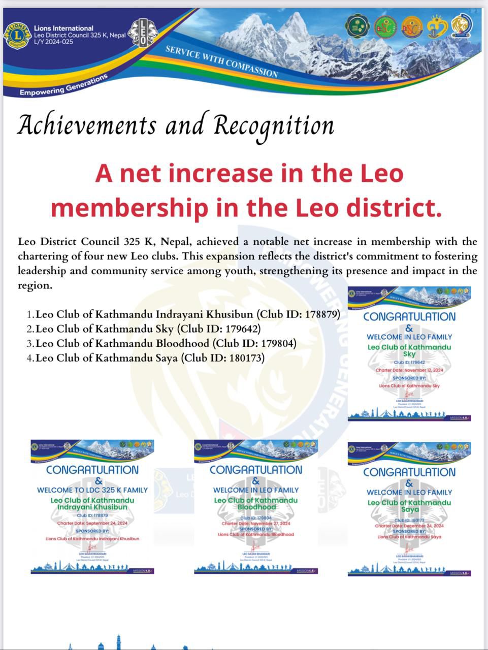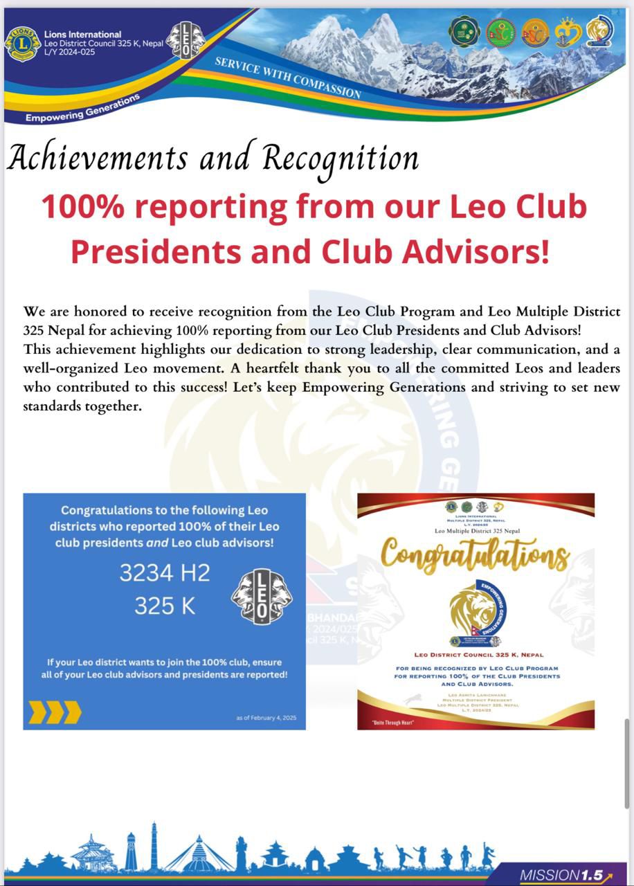 यी सबै कार्यक्रमहरू केवल सम्पन्न मात्र नभई, Lions Clubs International तथा Leo Club Program बाट पनि प्रशंसित र सम्मानित भएका छन्। विशेषगरी, MD 325 को इतिहासमै पहिलोपटक, साजन भण्डारीको नेतृत्वमा सबै लियो क्लबका अध्यक्ष र सल्लाहकारहरूको १००% रिपोर्टिङ सुनिश्चित भएको ऐतिहासिक उपलब्धि हासिल भएको छ। त्यसका साथै, LCIF मा पुर्याएको योगदानको लागि उहाँले अन्तर्राष्ट्रिय प्रमाणपत्र समेत प्राप्त गर्नुभएको छ, जसले लियो जिल्ला ३२५ के मात्र होइन, समग्र बहुल जिल्ला ३२५ नेपाललाई पनि अन्तर्राष्ट्रिय स्तरमा गौरवान्वित बनाएको छ।