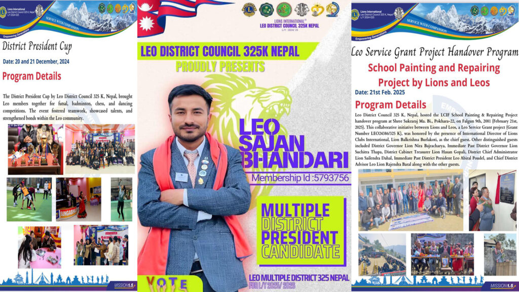 त्यसैले अब, लियो साजन भण्डारी बहुल जिल्ला अध्यक्ष (MDP) को भूमिकामा अघि बढ्नका लागि सबै दृष्टिकोणले सक्षम, अनुभवी र अन्तर्राष्ट्रियस्तरसम्म प्रतिनिधित्व गर्न सक्ने एक योग्य उम्मेदवार हुनुहुन्छ। उहाँको अनुभव, सिद्ध नेतृत्व क्षमताहरु र अबसम्मको प्रभावशाली कार्यसम्पादनको आधारमा, लियो बहुल जिल्ला ३२५, नेपाललाई नयाँ उचाइमा पुर्याउन सक्ने पूर्ण विश्वास उहाँमा देख्न सकिन्छ। तेसैले धेरै बौद्धिक व्यक्तिको रोजाईमा पनि पर्दै आएका भण्डारी लियो बहुल जिल्ला ३२५ निर्बाचित हुने संकेत पनि देखिन थालेको छ। उहाँका केहि महत्वपुर्ण कार्यहरु यसप्रकार छन्