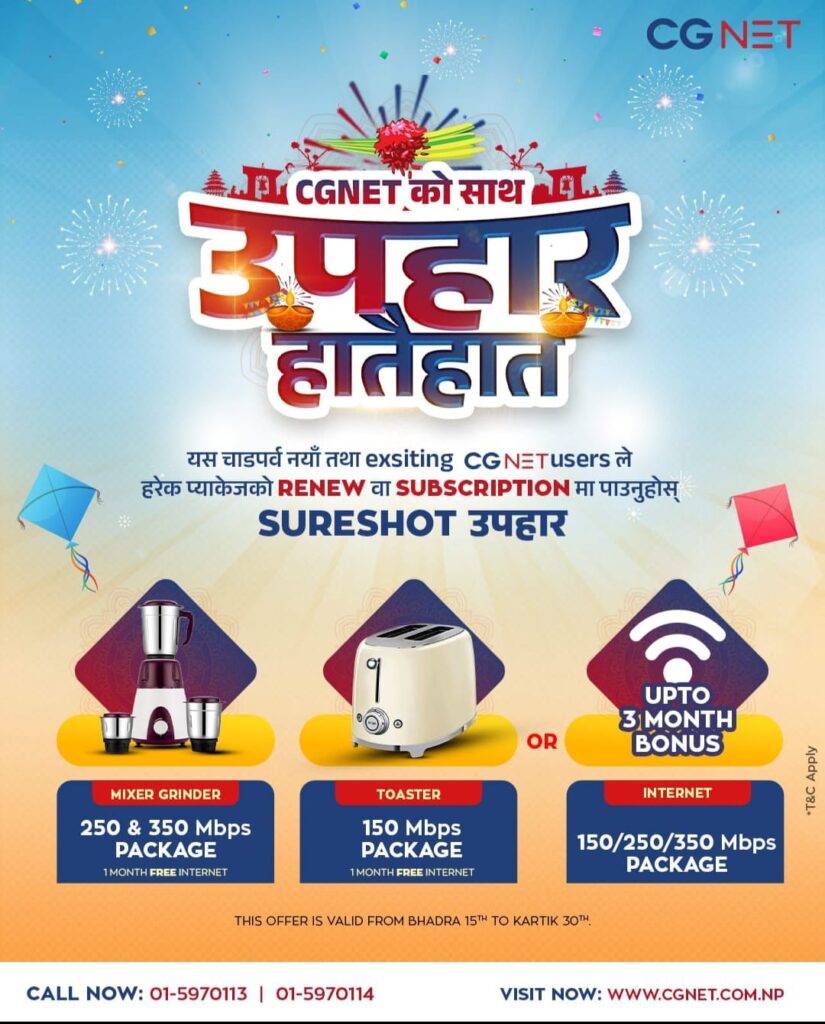 यो अफर भदौ १५ गतेदेखि कार्तिक ३० गतेसम्म सीमित समयका लागि लागू हुनेछ।सीजीनेटले सधैं आफ्ना ग्राहकलाई किफायती मूल्यमा द्रुतगति इन्टरनेटसँगै थप मूल्यवर्धन गर्ने प्रयास गर्दै आएको छ। यस चाडपर्वमा उपहारसहितको इन्टरनेट अफरले ग्राहकहरूलाई अझै लाभान्वित बनाउने कम्पनीको विश्वास छ।