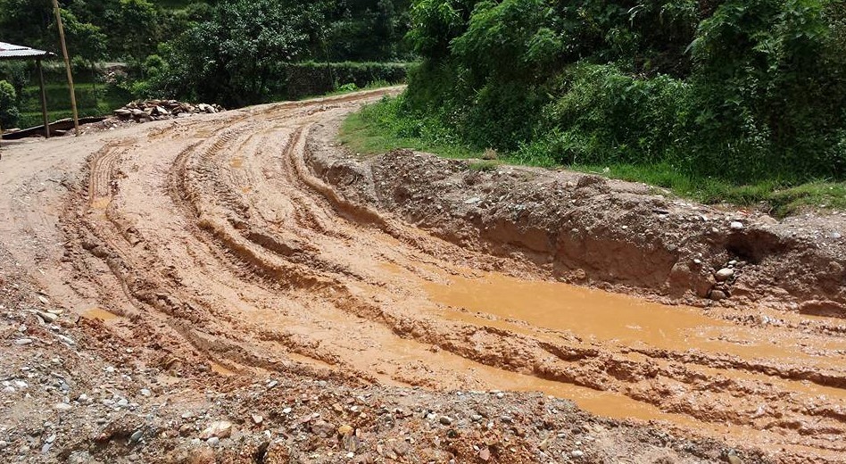 अरनिको राजमार्गको काभ्रेपलाञ्चोकको धुलिखेल नगरपालिका–८ पकुचास्थित निर्माणाधीन धुलिखेल–खावा सडकखण्डमा वर्षाले हिलाम्मे सडकमा बुधबार बिहान कष्टपूर्ण यात्रा गर्दै यात्रु ।